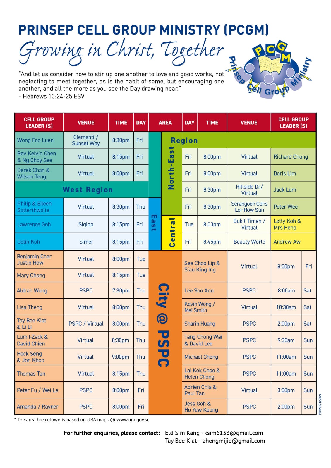 The objective of Prinsep Cell Group Ministry is to build a community of worshippers that is rooted in the Word of God (reach up) and equipped to make disciples for Jesus Christ (reach out) through the gathering of believers into cell groups (reach in).